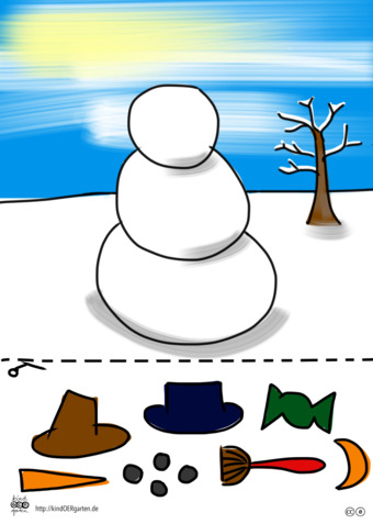 Das Bild zeigt einen Schneemann (farbig) und kann als Schnipselbildvorlage für Kinder im Kindergarten bzw. Elementarbereich dienen. Das Bild ist unter CC0 lizenziert und kann somit frei verwendet werden. Es ist neben weiteren Bildern auch hier zu finden: https://kindoergarten.wordpress.com/
