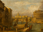 Die Abbildung zeigt einen Blick über die Tiberbrücke auf die Engelsburg (Castel Sant'Angelo), die Peterskirche und den Vatikan in einer historischen Ansicht. Das Bild stammt aus Band 1 von „Meyer's Universum oder Abbildung und Beschreibung des Sehenswerthesten und Merkwürdigsten der Natur und Kunst auf der ganzen Erde“, erschienen 1833. Das Digitalisat ist bei der Universitäts- und Landesbibliothek Düsseldorf unter https://nbn-resolving.org/urn:nbn:de:hbz:061:1-621229 abrufbar. Das Gesamtwerk wurde unter Public Domain Mark 1.0 Universell lizenziert, ist somit gemeinfrei und kann frei verwendet werden. Diese Bildvariante wurde mittels KI (Gemini) nachbearbeitet und coloriert.