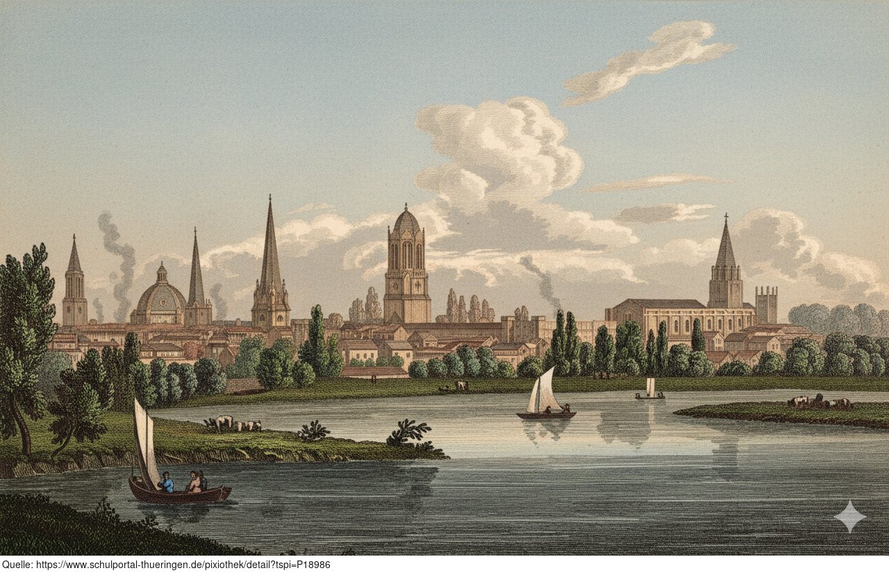Die Abbildung zeigt einen Blick auf Oxford in einer historischen Ansicht. Das Bild stammt aus Band 1 von „Meyer's Universum oder Abbildung und Beschreibung des Sehenswerthesten und Merkwürdigsten der Natur und Kunst auf der ganzen Erde“, erschienen 1833. Das Digitalisat ist bei der Universitäts- und Landesbibliothek Düsseldorf unter https://nbn-resolving.org/urn:nbn:de:hbz:061:1-621229 abrufbar. Das Gesamtwerk wurde unter Public Domain Mark 1.0 Universell lizenziert, ist somit gemeinfrei und kann frei verwendet werden. Diese Bildvariante wurde mittels KI (Gemini) nachbearbeitet und coloriert.