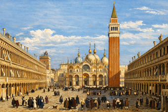 Die Abbildung zeigt den Markusplatz (Piazza San Marco) in Venedig in einer historischen Ansicht. Das Bild stammt aus Band 1 von „Meyer's Universum oder Abbildung und Beschreibung des Sehenswerthesten und Merkwürdigsten der Natur und Kunst auf der ganzen Erde“, erschienen 1833. Das Digitalisat ist bei der Universitäts- und Landesbibliothek Düsseldorf unter https://nbn-resolving.org/urn:nbn:de:hbz:061:1-621229 abrufbar. Das Gesamtwerk wurde unter Public Domain Mark 1.0 Universell lizenziert, ist somit gemeinfrei und kann frei verwendet werden. Diese Bildvariante wurde mittels KI (Gemini) nachbearbeitet und coloriert.
