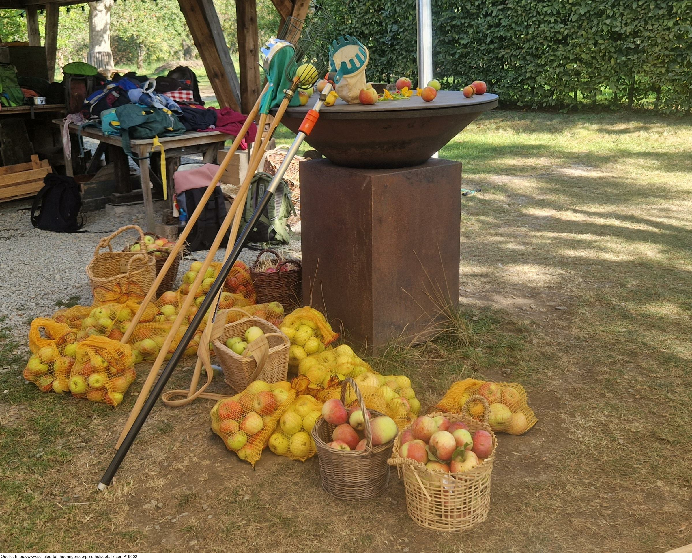 Das Bild zeigt eine Ansicht auf dem ApfelGut Erfurt. Zu sehen sind im Hintergrund die Jacken und Taschen einer Schulklasse, welche am außerschulischen Lernort zu Besuch ist. Im Vordergrund befinden sich Apfelpflücker bzw. Obstpflücker und bereits geerntete Äpfel in Netzen. Es gelten die Nutzungsbedingungen der Mediothek und Pixiothek.