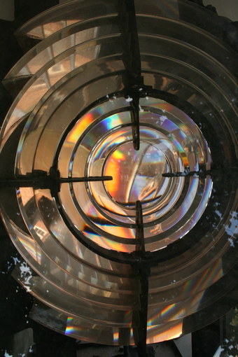 Abgebildet ist die Leuchtfeueroptik im Leuchtturm auf Kap Arkona. 1905 wurde das Licht des Leuchtturms durch zwei Leuchtfeueroptiken mit je drei Scheinwerferlinsen über elektrische Kohlenbogenlampen erzeugt. Im Bild ist eine Leuchtfeueroptik zu sehen, die heute für den Leuchtturmbetrieb mit lichtstarken Entladungslampen nicht mehr benötigt wird.