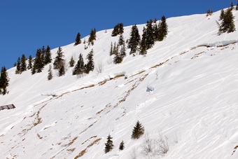Das Foto gehört zur Serie "Lawinenschutz" mit Fotos aus den Gegenden Walmendinger Horn (Österreich, Kleinwalsertal) und Fellhorn (Deutschland). Es zeigt den Abrissbereich einer Schneelawine (Schneebrett) an einem Berghang. Es gelten die Nutzungsbedingungen der Mediothek und Pixiothek.