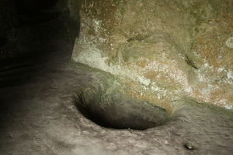 Externsteine im Teutoburger Wald: Bodenvertiefung (vermutlich Feuerstelle) in der Grotte