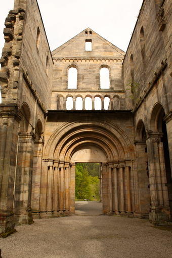 Das Foto gehört zur Serie "Klosterruine Paulinzella". Es zeigt die Ansicht vom Portal. - - Es gelten die Hinweis für Bilder mit Motiven von Stiftungsobjekten der Stiftung Thüringer Schlösser und Gärten: Es gilt grundsätzlich, dass die Bilder ausschließlich zur Bereitstellung für Unterrichtszwecke verwendet werden dürfen. Jede Art der darüber hinausgehenden Publikation der von einem Standort innerhalb der Stiftungs-Liegenschaften aufgenommenen Motive bedarf einer gesonderten schriftlichen Genehmigung durch die Stiftung Thüringer Schlösser und Gärten.
