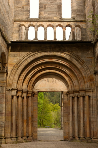 Das Foto gehört zur Serie "Klosterruine Paulinzella". Es zeigt die Ansicht vom Portal. - - Es gelten die Hinweis für Bilder mit Motiven von Stiftungsobjekten der Stiftung Thüringer Schlösser und Gärten: Es gilt grundsätzlich, dass die Bilder ausschließlich zur Bereitstellung für Unterrichtszwecke verwendet werden dürfen. Jede Art der darüber hinausgehenden Publikation der von einem Standort innerhalb der Stiftungs-Liegenschaften aufgenommenen Motive bedarf einer gesonderten schriftlichen Genehmigung durch die Stiftung Thüringer Schlösser und Gärten.