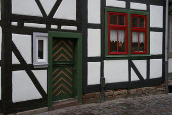 Das Foto gehört zur Serie "Schmalkalden". Es zeigt das Fachwerk und die Eingangstür eines Hauses in der Altstadt. Es gelten die Nutzungsbedingungen der Mediothek und Pixiothek.