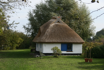 Dieses Bild zeigt das Hexenhaus in Vitte. Es wurde 1755 als Fischerkate gebaut, überstand 1872 eine schwere Sturmflut und gilt heute als eines der ältesten reetgedeckten Häuser der Insel Hiddensee. Es gelten die Nutzungsbedingungen der Mediothek und Pixiothek.