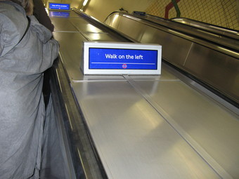 Das Foto gehört zur Serie London 2016. Es zeigt ein Hinweisschild auf der Rolltreppe zur U-Bahn (Underground, Subway, Tube). Es gelten die Nutzungsbedingungen der Mediothek und Pixiothek.