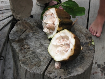Das Foto gehört zur Serie "Kakao". Es zeigt eine geöffnete Kakaofrucht. Es gelten die Nutzungsbedingungen der Mediothek und Pixiothek.