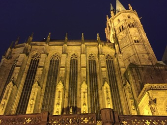 Abgebildet ist der beleuchtete Erfurter Dom bei Nacht, aufgenommen zum Weihnachtsmarkt 2018. Es gelten die Nutzungsbedingungen der Mediothek und Pixiothek.