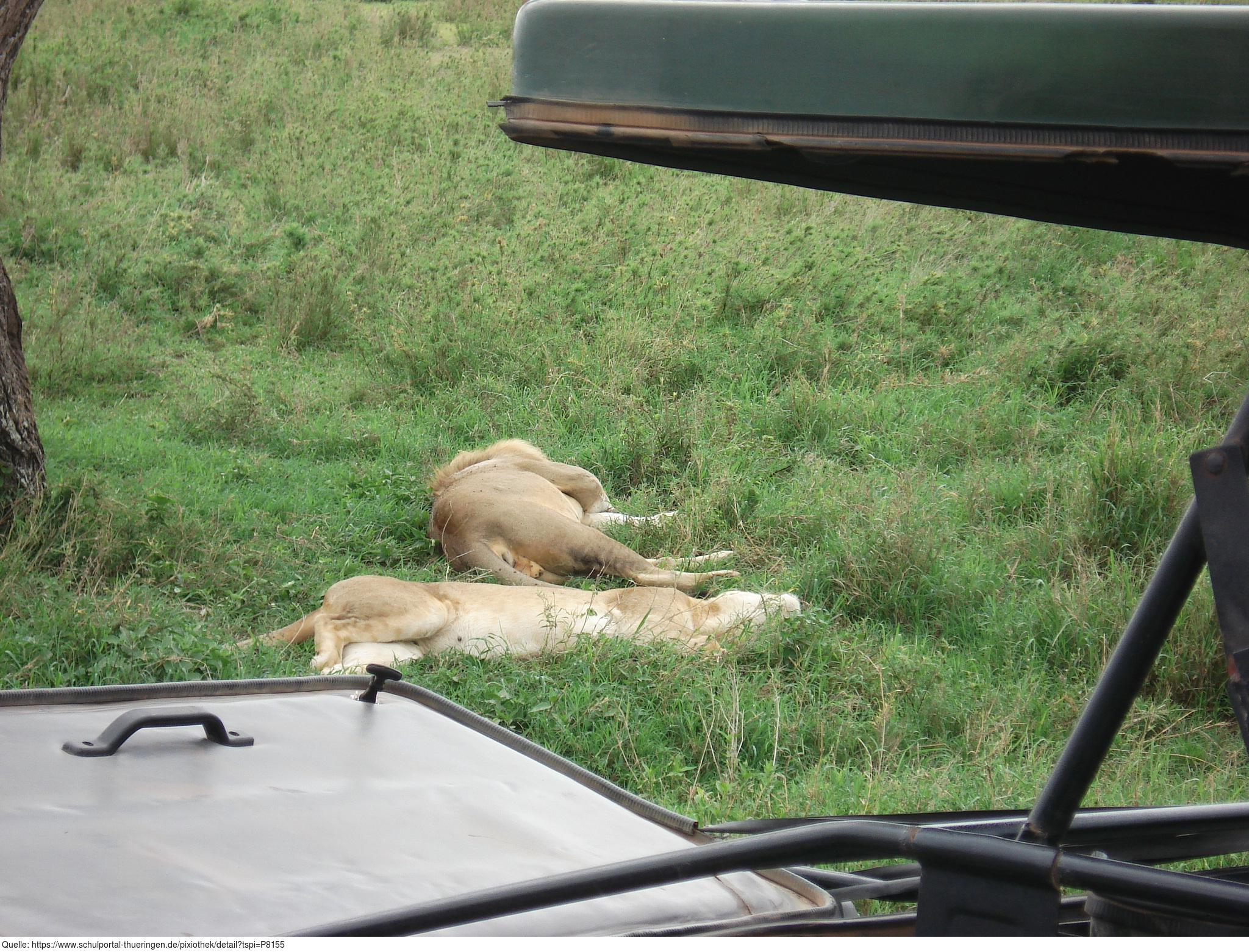 Abgebildet sind Löwen in Tansania. Löwen gehören zur Ordnung Raubtiere (Carnivora), zur Überfamilie Katzenartige (Feloidea) und zur Familie Katzen (Felidae).
