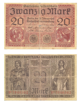Das Foto gehört zur Serie "Währungen im Deutschen Kaiserreich 1914 bis 1918". Es zeigt einen Darlehenskassenschein über "Zwanzig Mark" vom 20. Februar 1918. Es gelten die Nutzungsbedingungen der Mediothek und Pixiothek.