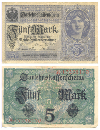 Das Foto gehört zur Serie "Währungen im Deutschen Kaiserreich 1914 bis 1918". Es zeigt einen Darlehenskassenschein über "Fünf Mark" vom 05. August 1917. Es gelten die Nutzungsbedingungen der Mediothek und Pixiothek.