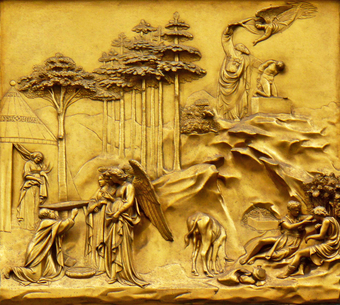 Das Foto gehört zur Serie "Paradiestür am Baptisterium von Florenz". Es zeigt Abraham und Isaak, ein Bronzerelief von Lorenzo Ghiberti. Es ist rechts in der zweiten Reihe der zehn Bildtafeln in seine Paradiestür (auch Paradiespforte genannt) eingebunden. Es gelten die Nutzungsbedingungen der Mediothek und Pixiothek.