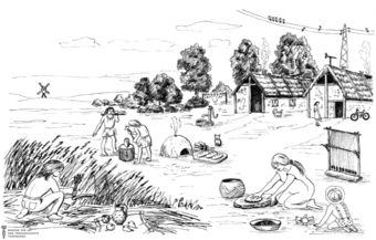 Das Bild gehört zur Serie "Zeichnungen Steinzeit - Museum für Ur- und Frühgeschichte Thüringens". Abgebildet ist eine Steinzeitsiedlung mit versteckten Fehlern. Es gelten die Nutzungsbedingungen der Mediothek und Pixiothek.