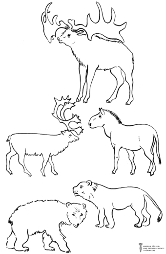 Das Bild gehört zur Serie "Zeichnungen Steinzeit - Museum für Ur- und Frühgeschichte Thüringens". Abgebildet sind Tiere der Eiszeit. Es gelten die Nutzungsbedingungen der Mediothek und Pixiothek.