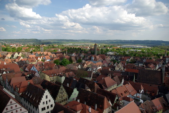 Das Foto zeigt einen Blick vom Turm auf einen Teil der mittelalterlichen Altstadt von Rothenburg ob der Tauber. Das Bild ist unter CC0 lizenziert und kann somit frei verwendet werden.