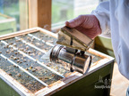 Imker am geöffneten Bienenvolk mit Smoker