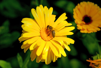 Das Foto gehört zur Serie "Blüten von Blumen". Es zeigt eine Biene auf der Blüte einer Ringelblume (Calendula officinalis). Das Bild ist unter CC0 lizenziert und kann somit frei verwendet werden.