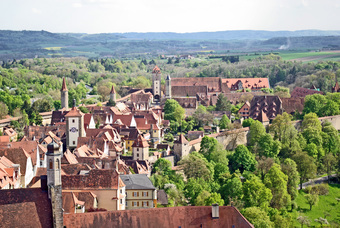 Das Foto zeigt einen Blick vom Turm auf einen Teil der mittelalterlichen Altstadt von Rothenburg ob der Tauber. Das Bild ist unter CC0 lizenziert und kann somit frei verwendet werden.