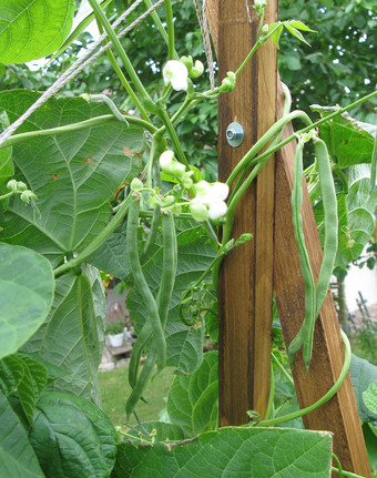 Das Foto gehört zur Serie "Gemüse". Es zeigt Pflanzen der Gartenbohne. Gartenbohnen, die unbegrenzt wachsen und sich dabei stark winden, bekommen vom Gärtner Stangen als Rankhilfen (Stangenbohnen). Das Bild ist unter CC0 lizenziert und kann somit frei verwendet werden.