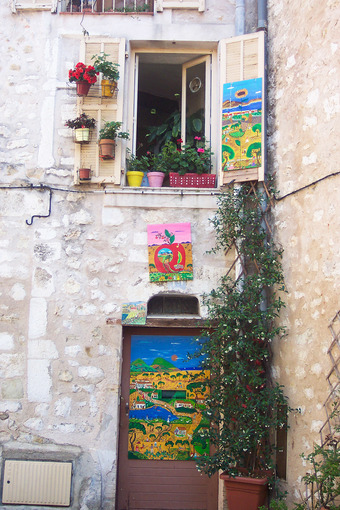Das Bild gehört zur Serie "Provence und Côte d’Azur". Es zeigt die künstlerische Gestaltung von Haustür und Fenster an einem Haus in Südfrankreich. Das Bild ist unter CC0 lizenziert und kann somit frei verwendet werden.
