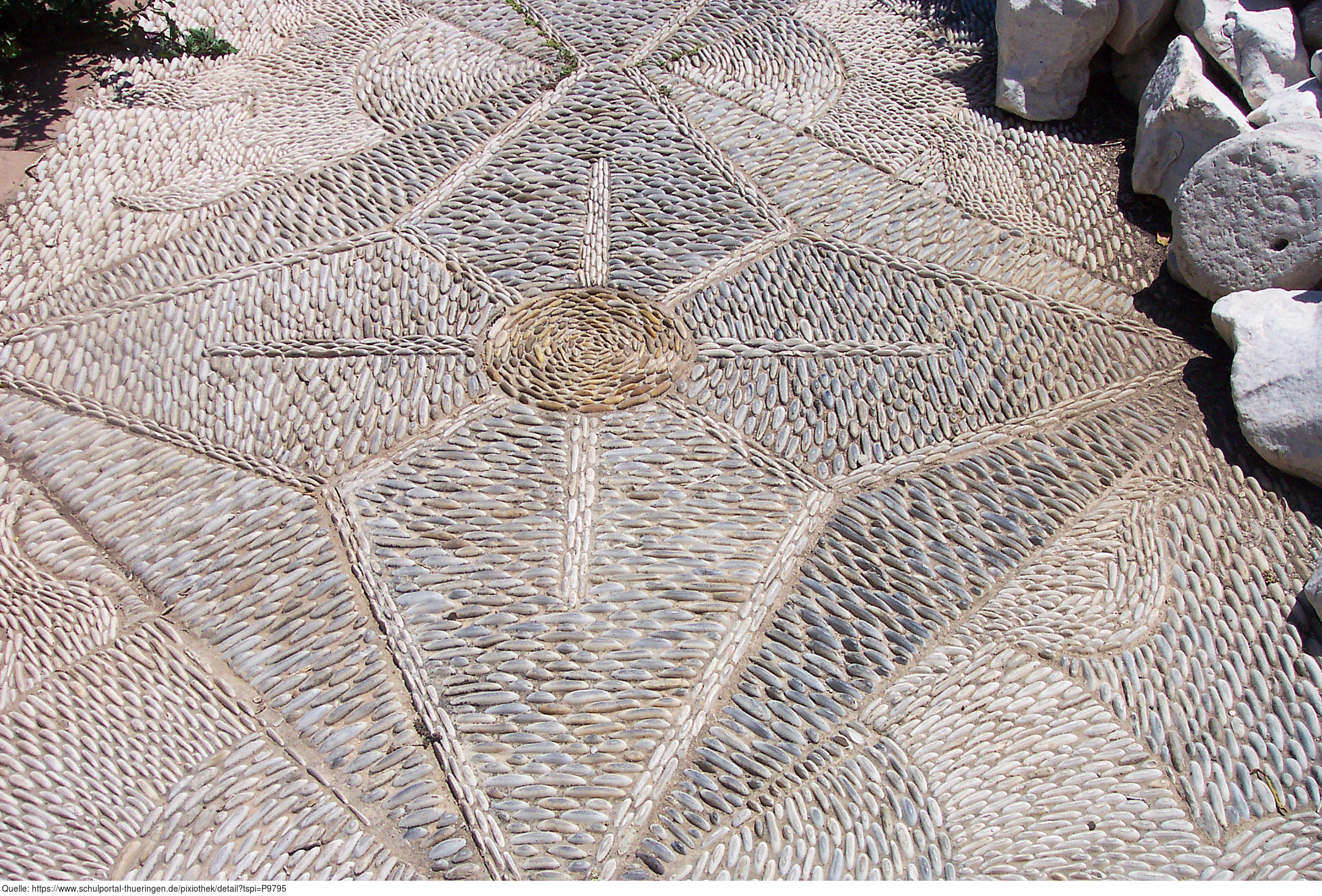 Das Foto gehört zur Serie "Strukturen und Oberflächen". Es zeigt eine mit Natursteinen gepflasterte Fläche. Das Ornament besteht aus länglich-ovalen Steinen, die aus dem Geröll natürlicher Wasserläufe stammen. Das Bild ist unter CC0 lizenziert und kann somit frei verwendet werden.