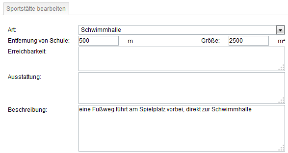 Die Art der Sportstätte und die Beschreibung sind Pflichtfelder, wobei die Sportstätten-Art aus einem Drop-Down-Menü gewählt wird. Die Entfernung von der Schule wird in Metern angegeben, die Größe in m². Die Einheiten brauchen Sie in beiden Fällen nicht angeben, da sie automatisch angezeigt werden.
