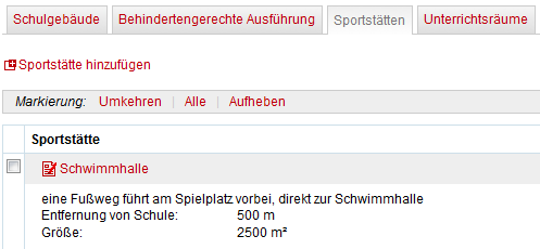 Für eine übersichtlichere Darstellung im Schulporträt können Sie bei der Eingabe der Erreichbarkeit, der Ausstattung und der Beschreibung der Sportstätte Zeilenumbrüche nutzen.