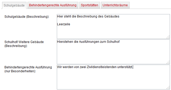 Für eine übersichtlichere Darstellung im Schulporträt können SIe bei der Eingabe des Schulgebäudes, des Schulhofes und der behindertengerechten Ausführung Zeilenumbrüche nutzen.